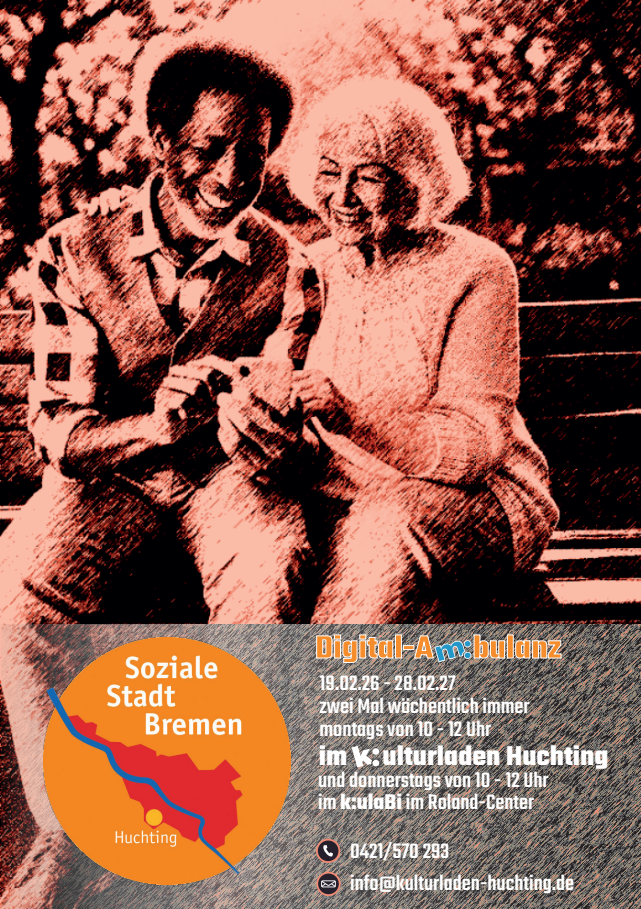 Die Digital-Ambulanz findet Montags von 10:00-12:00 im k:ulturladen Huchting hier auf dem Gelände und Donnerstags von 10:00-12:00 im k:uLaBi im Roland Center statt.